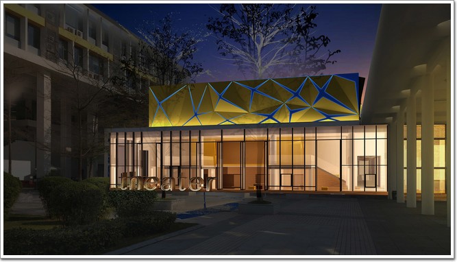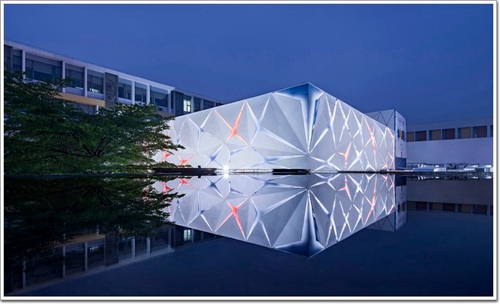 完成后的礼堂外观脱胎换骨,成了学生眼中不可多得的艺术品,非常地吸引眼球。外观采用现代化的设计,grc构件打造,明艳而简洁,抽象化的几何造型,给人巨大的想象空间和未来感。特别是晚上打开安装在其间的彩灯,美轮美奂,灯光穿过GRC构件间相互投射,给人产生或明或暗的神秘感。可以说设计团队也费了不少功夫塑造经典,留住美丽!