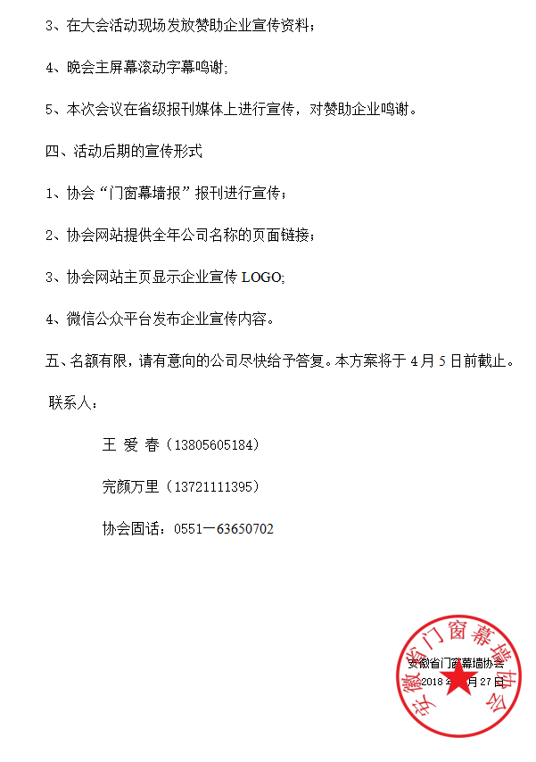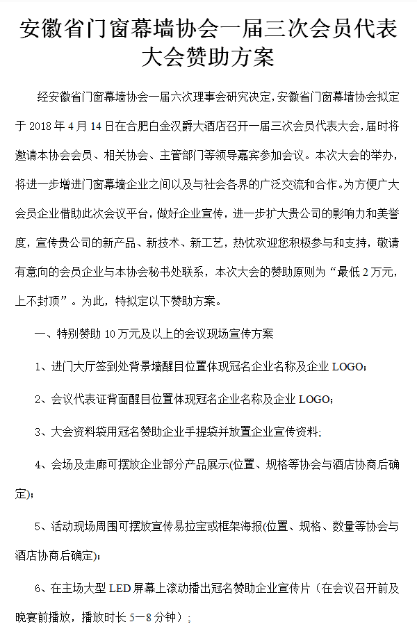 安徽省门窗幕墙协会一届三次会员代表大会赞助方案