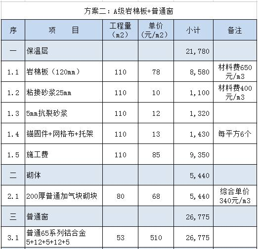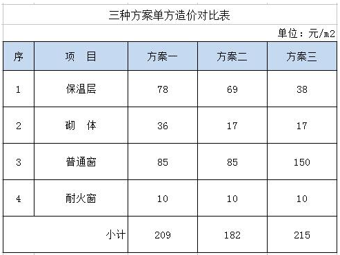 方案二:A级岩棉板 + 普通节能窗 方案三:B1级聚苯板 + 耐火窗(0.5小时) 对上述三个方案进行对比,成本数据整理如下: