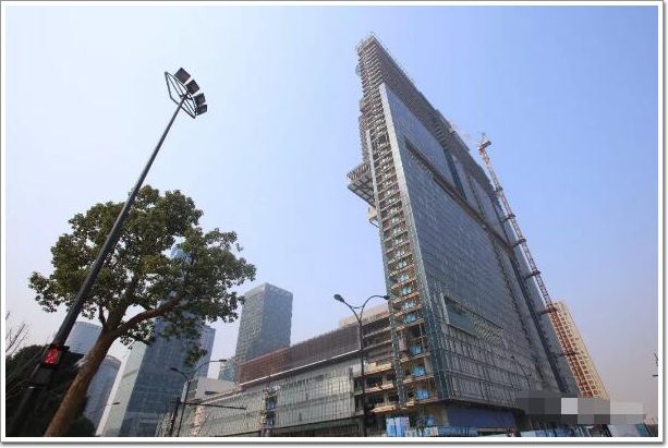 该建筑为杭州高德置地广场项目, 由世界顶级设计公司SOM担纲总体设计, 建筑立面体现“站立的西湖”理念。