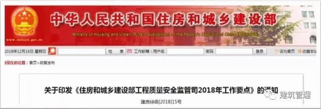 2018年3月,住房和城乡建设部工程质量安全监管司在其发布的《2018年工作要点》中关于第一条就提出“开展工程质量提升行动,推动建筑业质量变革”,明确要求: 健全质量保障体系。贯彻落实党中央、国务院关于开展质量提升行动的部署要求,深入开展工程质量提升行动,健全工程质量保障体系。严格落实各方主体责任,强化建设单位首要责任,全面落实质量终身责任制。 强化政府监管,保障监督机构履行职能所需经费,推行“双随机、一公开”检查方式,加大工程质量监督检查和抽查抽测力度,督促质量责任落实。