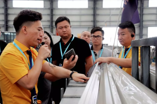 参观系统门窗生产车间 最后奋安铝业集团梁观荣副总裁作了总结性发言并对奋安门窗近年的发展态势进行了梳理,强调了产品质量、产品创新和经营理念。