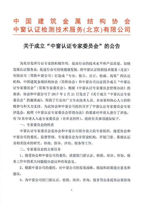 关于成立“中窗认证专家委员会”的公告