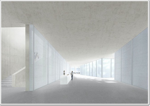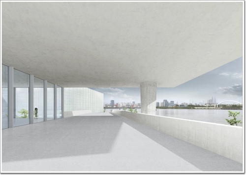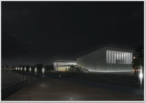 三个展厅体块紧贴三个方向的建筑控制线,围合形成一个独特的滨江空间。建筑的中心区域由三个各具特色的空间元素构成:三层层叠设置的美术馆大堂及连通上下的中庭空间;滨江线形布置的单层咖啡厅及利用其屋顶形成的连接美术馆二层大堂的景观露台;连接美术馆地下展览空间和滨江露台及休闲步道的下沉花园。