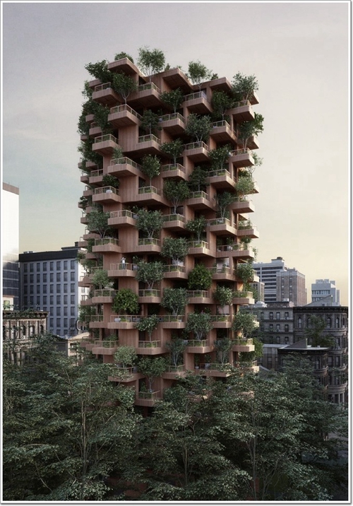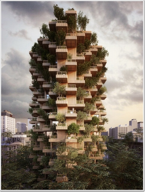 据悉,树塔楼高度为62米 (203英尺) ,建筑面积超过5000平方米 (53,800平方英尺)。其中大部分(4500平方米) 是居住单元,550平方米 (5,920平方英尺) 为公共空间,包括咖啡厅、日托中心和社区工作站。整座树塔看似结构凌乱,但实上非常规则,每一层的露台都规律的错开,并配备丰富的绿值,巨大的室外阳台可以支持容纳种植花园、灌木甚至大型树木的植物系统,这些都将被动的冷却建筑并为每个单元提供隐私。树木直接紧邻结构木板,自然界和建筑环境产生一种象征性的共生关系,这种将地面景观延伸至空中的形式,使整座树塔形成一层丰富的植物幕墙。