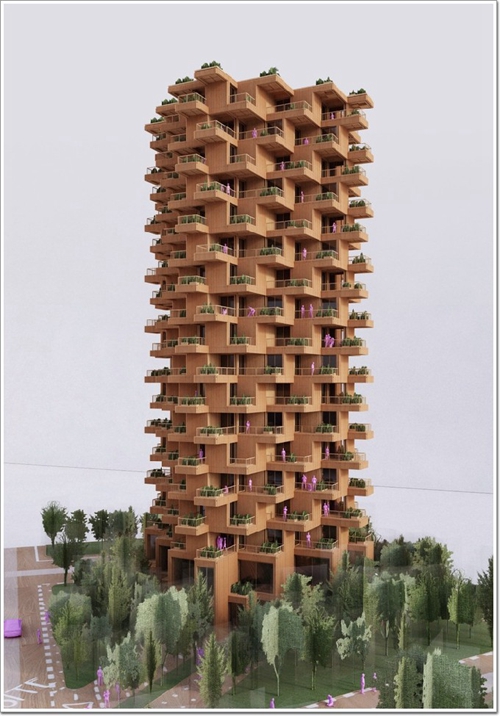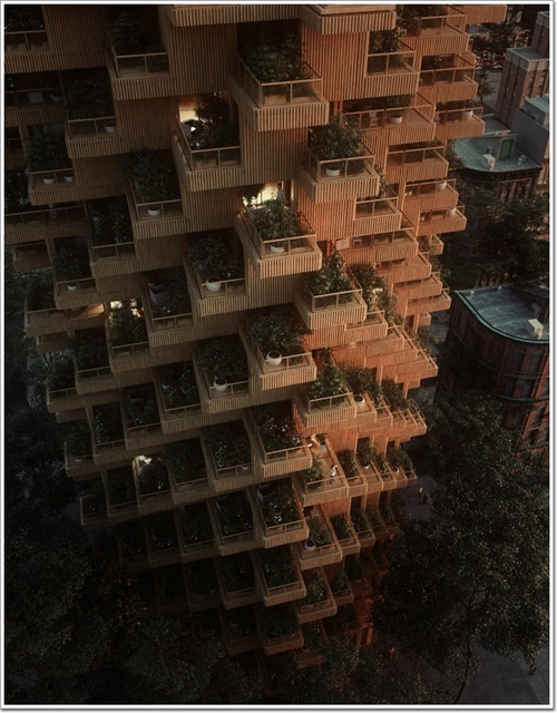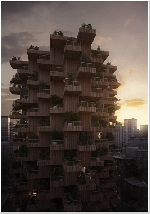 槃达的建筑师与CLTbrandTmber的木材顾问携手合作,在加拿大最大的城市多伦多设计推出了一栋模块化的天然高层塔楼。该大楼共18层,为木结构综合体住宅大楼,材料使用交叉复合木材,命名为——多伦多树塔 。这无疑是受到了加拿大传统居住模块建筑的启发,包括被视为可持续高层建筑的新典范,由Moshe Safdie设计的地标建筑67住区,这座塔楼使城市与自然和自然材料重新建立连接。