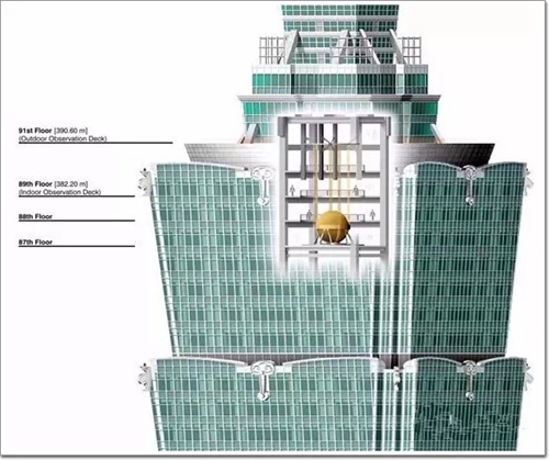 对于101这样的摩天塔状大楼来说,不需要地震,当风力达到足够大时就足以对建筑物产生形变,使得居于其中的人感觉到“震感”。而大圆球被放置在楼顶,当外力作用于建筑物的时候,建筑物的摆动产生的能量会被传导至大圆球,而大圆球的质量刚刚好可以在建筑物整体摆动时,由于惯性的作用向相反方向摆动,从而中和建筑物的形变。