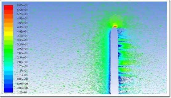 上图,我们可以看到在建筑后方有漩涡脱落的想象,通过数值模拟能够捕捉到这种流场现象。这也是数值模拟优于风洞试验的地方。
