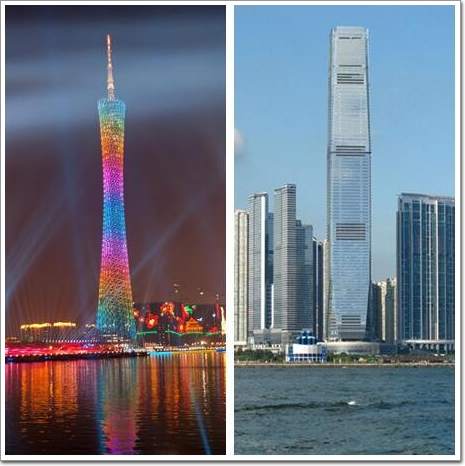 左:广州“小蛮腰”(600m) 右:香港环球贸易广场(484m)
