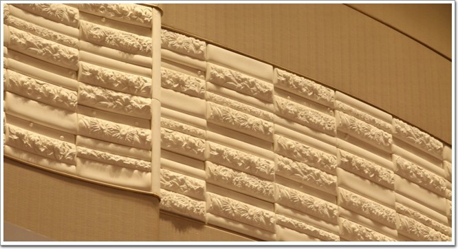 此外,在内装方面,则由亚厦装饰倾力打造。在场馆的装修当中,为了追求最完美的视觉效果,装饰团队从材料种类、颜色搭配、肌理效果到纹路方向,都进行了精细调整,并充分利用了环保再循环的材料,金砖会晤以后场馆里面的有一些设施可以进行拆卸回收使用。值得一提的是,五国大范围会议室的主背景墙上,宋代名窑之一的德化瓷被做成了金砖五国国花的造型“贴”在了墙上,“把宋代名瓷当‘瓷砖’,由于是第一次,项目部尤其谨慎,派专人到德化瓷生产地,考察当地土质,考察厂家工艺,还要严格规定德化瓷采土的位置、深度,不容丝毫马虎。