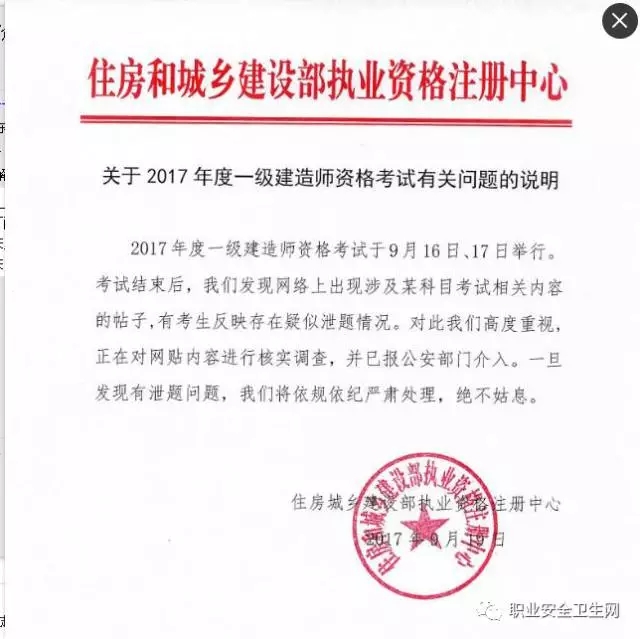 2017年度一级建造师资格考试于9月16日、17日举行。考试结束后,我们发现网络上出现涉及某科目考试相关内容的帖子,有考生反映存在疑似泄题情况。对此我们高度重视,正在对网贴内容进行核实调查,并已报公安部介入。一旦发现有泄题问题,我们将依规依纪严肃处理,绝不姑息。
