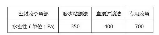 贝克洛胶角应用↑ 胶角连接法, 在拐角处过渡顺畅自然, 且大幅度提高角部密封性能, 当相同典型窗使用不同角部密封方法, 经检测,得相关水密性能如下: