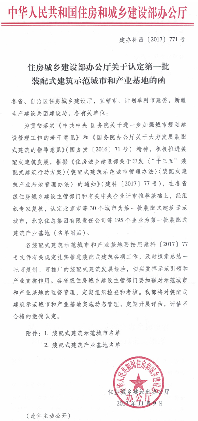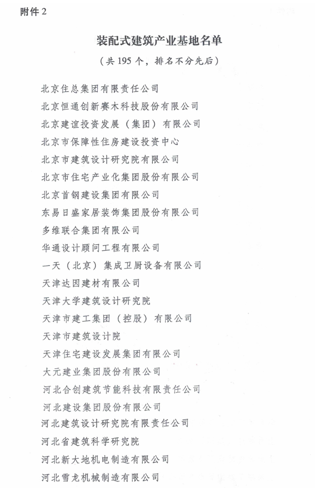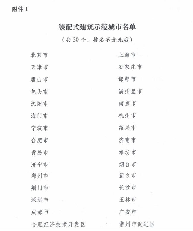 为贯彻落实《中共中央国务院关于进一步加强城市规划建设管理工作的若干意见》和<<>国务院办公厅关于大力发展装配式建筑的指导意见》(国办发【2016)71号)精神,积极推进装配式建筑发展,根据(住房城乡建设部关于印发<<>“十三五”装配式建筑行动方案><<>装配式建筑示范城市管理办法>(装配式建筑产业基地管理办法>的通知》(建科(2017)77号),在各省级住房城乡建设主管部门和有关中央企业评审推荐基础上,经组织专家复核,认定北京市等30个城市为第一批装配式建筑示范城市。同时北京、上海、广东、福建、湖南、山东、四川、安徽、河北等地区的建筑设计院,以及远大可建、中建科技、苏州金螳螂、浙江亚厦、广州白云化工、成都硅宝科技、北新建材等,共计195家企业为第一批装配式建筑产业基地。