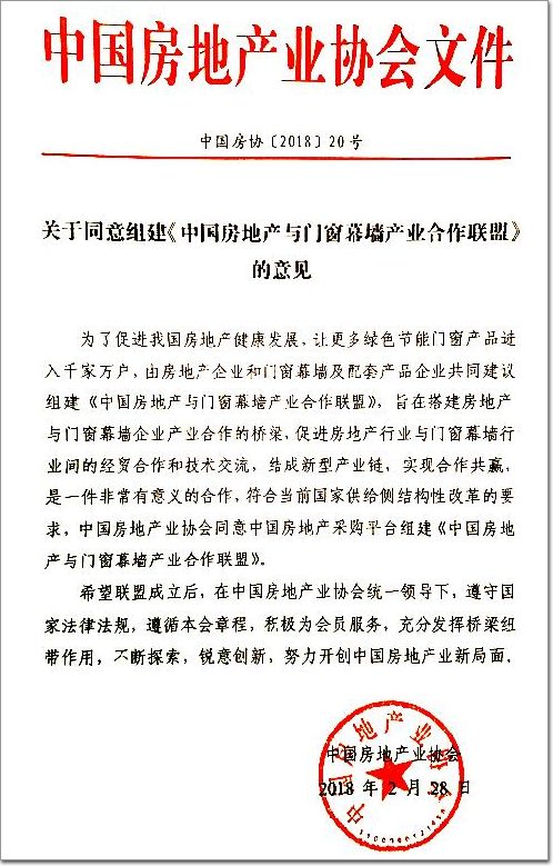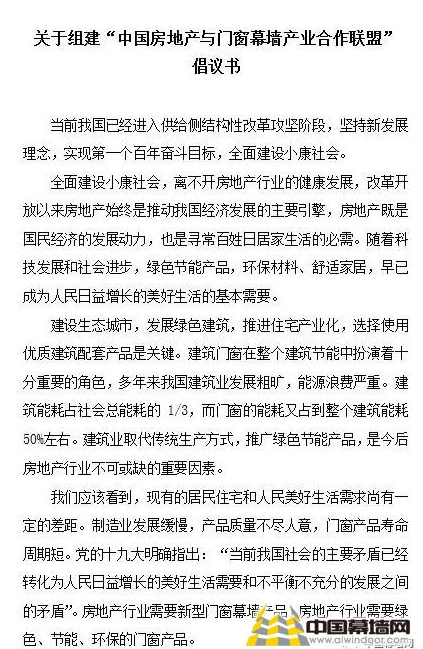中国房地产与门窗幕墙产业合作联盟倡议书部分内容: