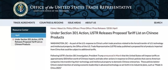 美国当地时间4月3日下午,美国贸易代表办公室网站发布根据所谓301调查,建议加征关税的自中国进口产品清单,该清单包含大约1300个独立关税项目,价值约500亿美元,涉及航空航天、信息和通信技术、机器人和机械等行业。美国贸易代表办公室建议对清单上中国产品征收额外25%的关税。