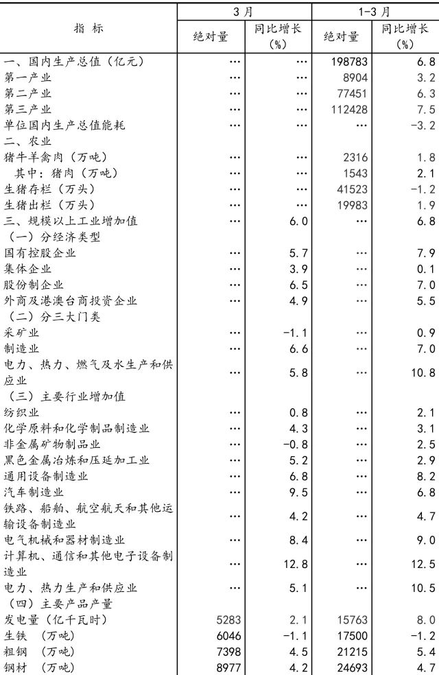 初步核算,一季度,国内生产总值198783亿元,按可比价格计算,同比增长6.8%。分产业看,第一产业增加值8904亿元,同比增长3.2%;第二产业增加值77451亿元,增长6.3%;第三产业增加值112428亿元,增长7.5%。