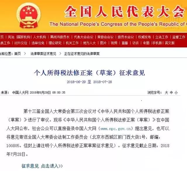 近日,中国人大网发布了个人所得税法修正案草案(征求意见稿),
