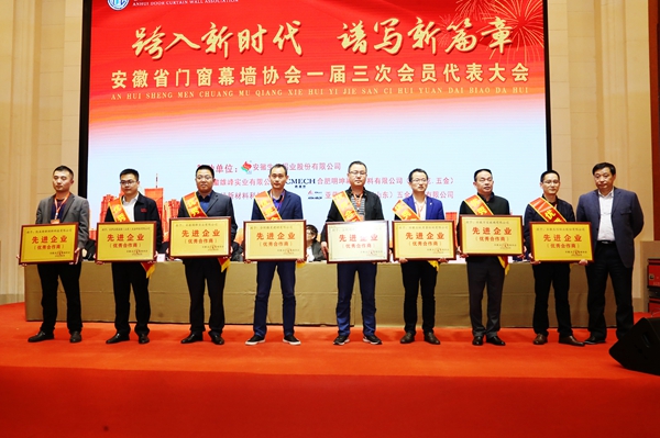 会议上宣布了安徽门窗幕墙协会新增会员单位名单和晋级单位名单,并为新增会员单位和晋级单位授牌及颁发证书;宣读“先进企业”和“优秀合作商”表彰决定,并为获得20家“先进企业”和8家“优秀合作商”的会员单位颁发了奖牌。