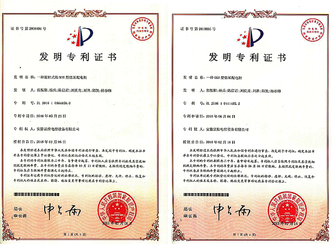 近日,安徽富煌电控设备有限公司申请的《一种GGD型低压配电柜》、《一种旋转式的MNS型低压配电柜》荣获国家专利局授予发明专利权。